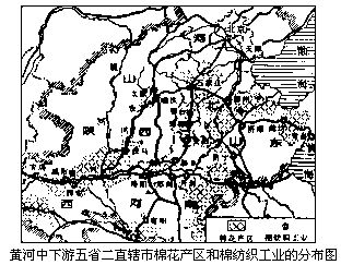 仔細(xì)觀察分析一下課本上的插圖(圖見(jiàn)下頁(yè)),先用彩色鉛筆把棉區(qū)和棉紡中心顯示出來(lái)(棉區(qū)用綠色,老棉紡中心用黃色,新棉紡中心用紅色表示),然后思考下列問(wèn)題: