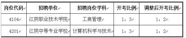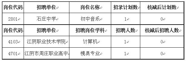 根據(jù)《2014年江陰市公開招聘教師公告(一)、(二)》規(guī)定,經(jīng)現(xiàn)場報名、資格初審,部分崗位因無人報名或報名人數(shù)未達到1:3開考比例,報無錫市公開招聘綜合管理部門核準,現(xiàn)將公開招聘教師計劃調(diào)整如下: