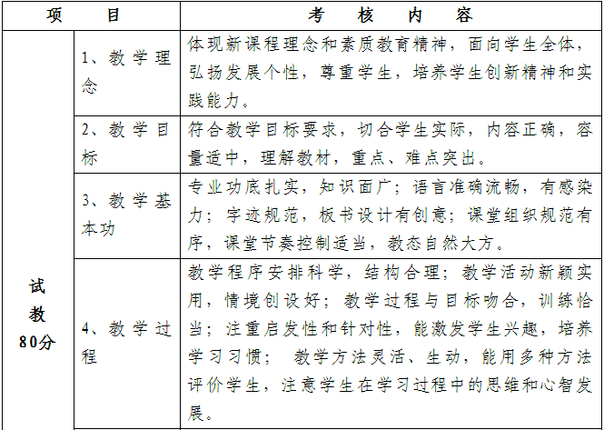 4、試教、面試兩項合并進行?忌冗M行試教(試教時間8分鐘),試教完畢后馬上進行面試,面試問題1個,考生閱題、答題時間共3分鐘。試教、面試結(jié)束后,評委結(jié)合試教和面試情況,對考生進行綜合打分。