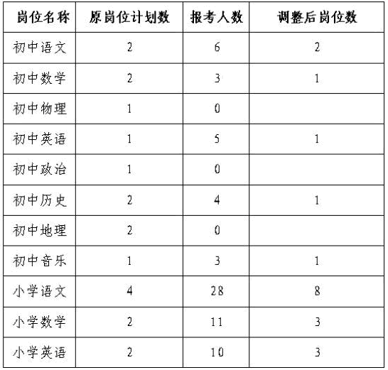 按照《張灣區(qū)2014年公開招聘中小學(xué)教師方案》精神,“報(bào)名人數(shù)達(dá)不到開考比例1:3的崗位予以減少或取消,減少或取消的崗位計(jì)劃,調(diào)整到其他學(xué)科”。根據(jù)報(bào)名具體情況,本次減少和取消的崗位共有6個(gè),其中減少的崗位及數(shù)量是:初中數(shù)學(xué)1個(gè)、初中歷史1個(gè);取消的崗位及數(shù)量是:初中物理1個(gè)、初中政治1個(gè)、初中地理2個(gè)。經(jīng)張灣區(qū)正常補(bǔ)充機(jī)制領(lǐng)導(dǎo)小組研究,決定將減少和取消的6個(gè)崗位分別調(diào)整到小學(xué)語文、小學(xué)數(shù)學(xué)、小學(xué)英語崗位中。調(diào)整后崗位如下: