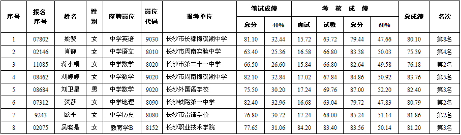 根據(jù)《2014年長(zhǎng)沙教育局直屬單位公開(kāi)招聘教師公告》相關(guān)規(guī)定,遞補(bǔ)以下8人進(jìn)入體檢,請(qǐng)遞補(bǔ)進(jìn)入體檢的考生保持通訊暢通。