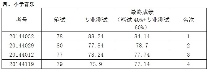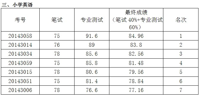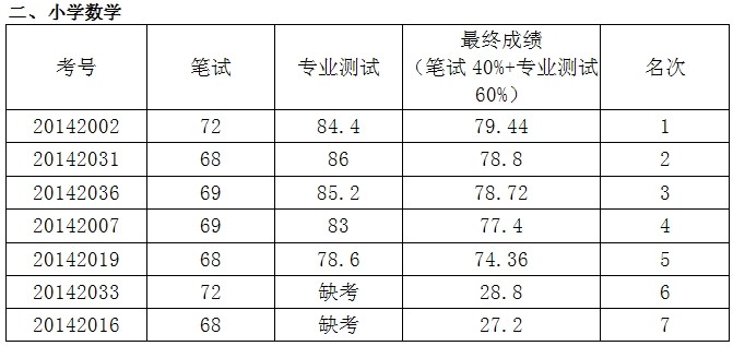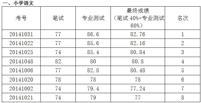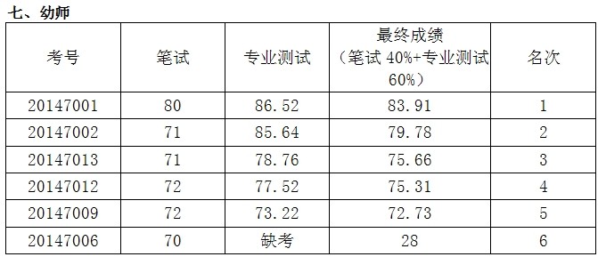 根據(jù)《2014年株洲市蘆淞區(qū)公開(kāi)招聘小學(xué)及幼兒園教師公告》,我區(qū)于8月27日舉行了第二輪專業(yè)測(cè)試,現(xiàn)將成績(jī)公布如下: