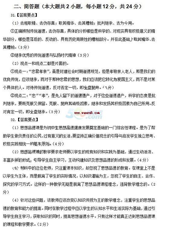 2014上半年教師資格考試《初中思想品德學科知識與教學能力》真題答案