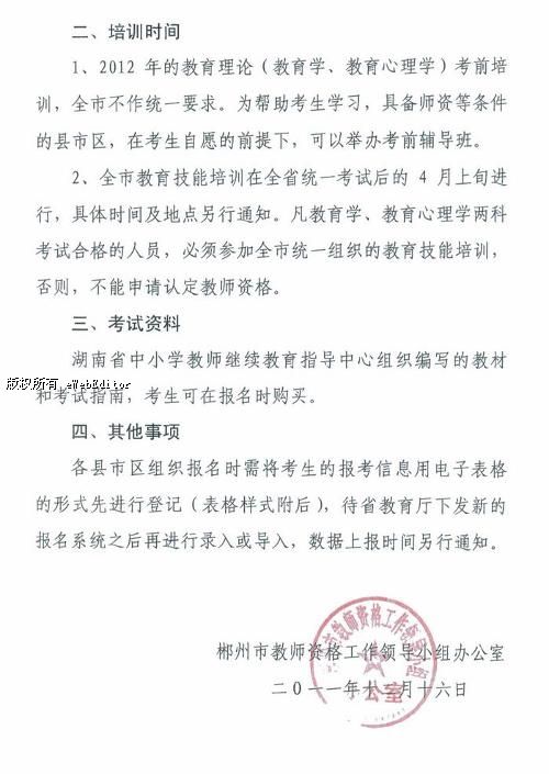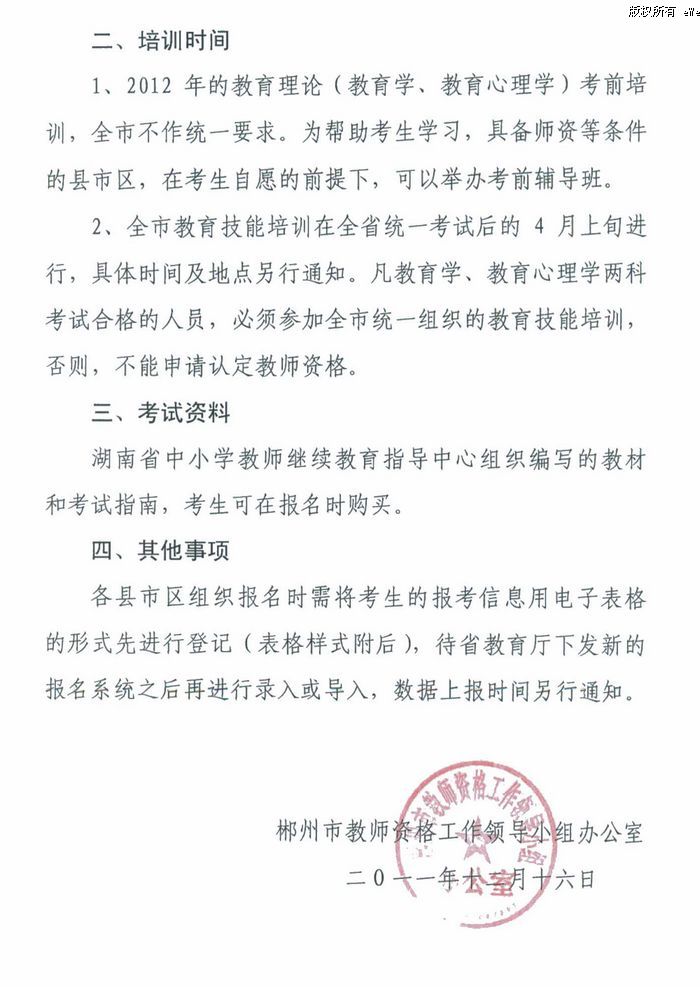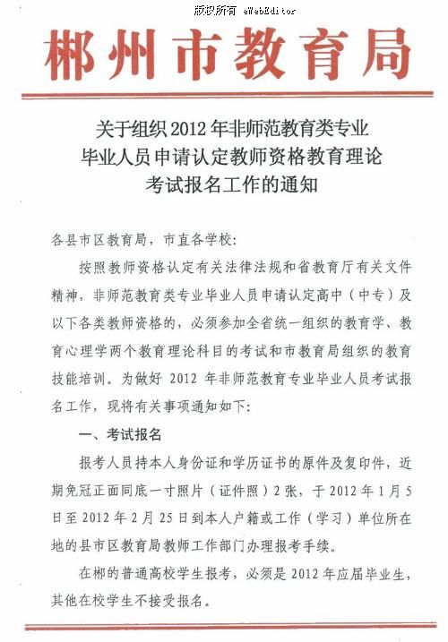郴州市2012年教師資格證教育理論考試報(bào)名時(shí)間:1月5日-2月25
