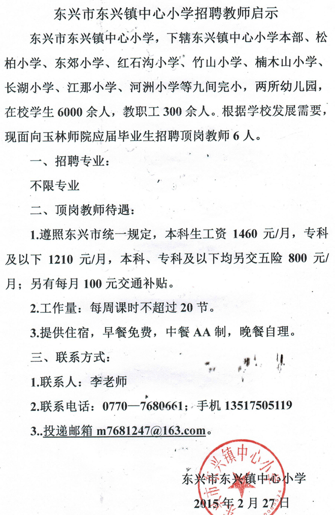 2015年廣西防城港市東興市東興鎮(zhèn)中心小學(xué)教師招聘啟示