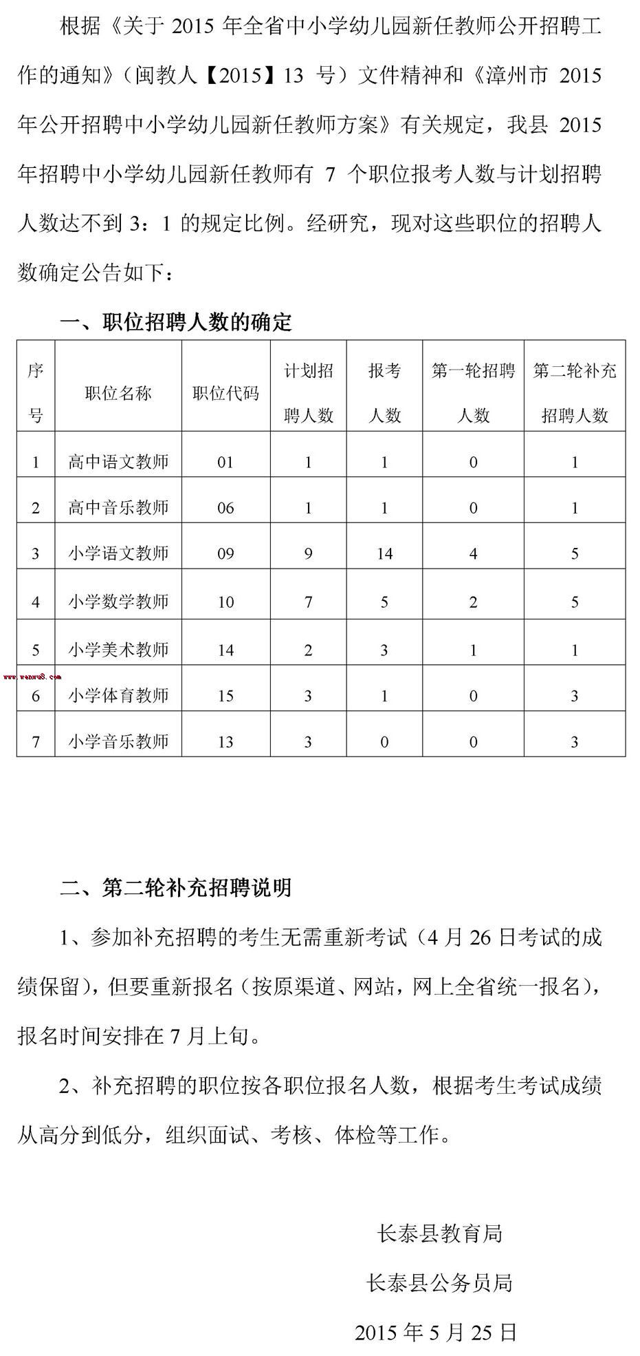 福建省漳州市長(zhǎng)泰縣2015年招聘中小學(xué)幼兒園新任教師補(bǔ)充招聘公告