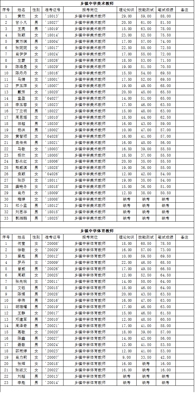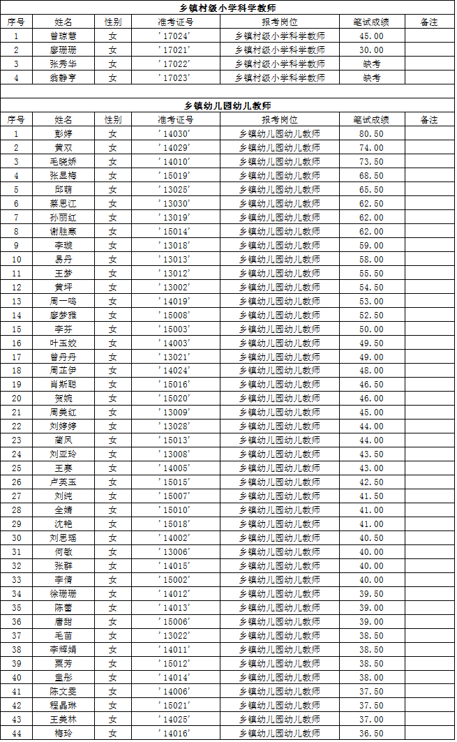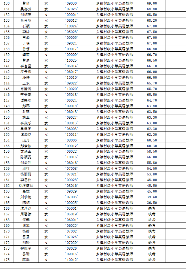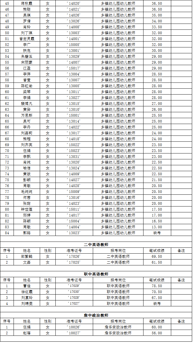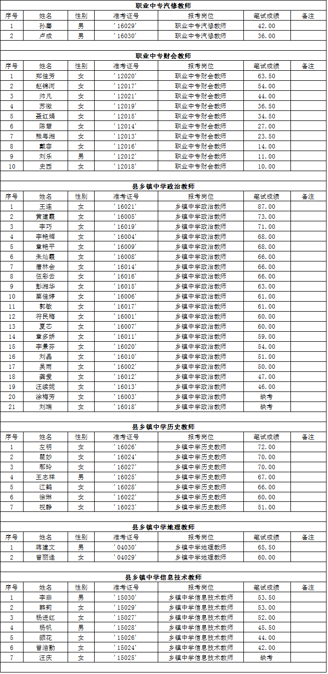 湖南省常德市漢壽縣2015年第二批教師招聘考試筆試成績公示