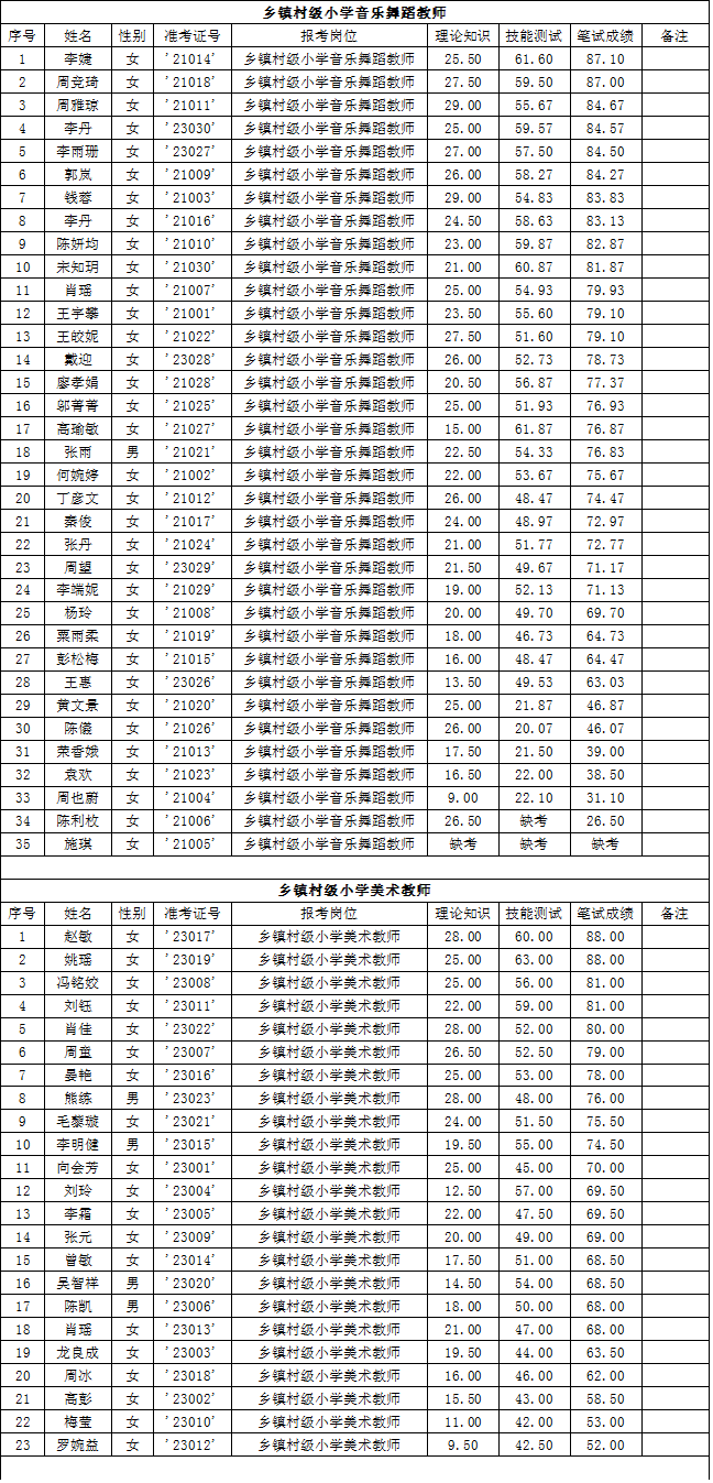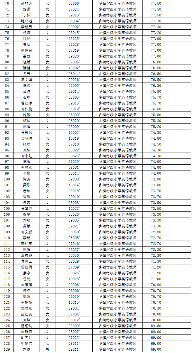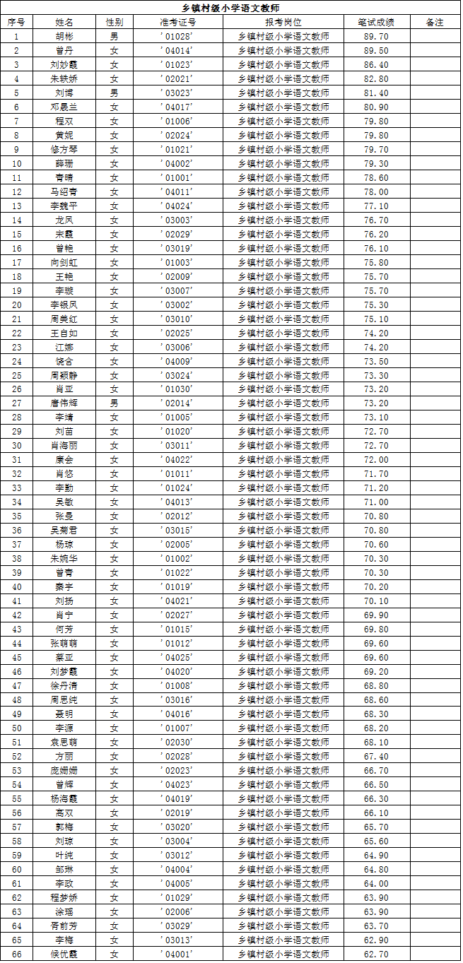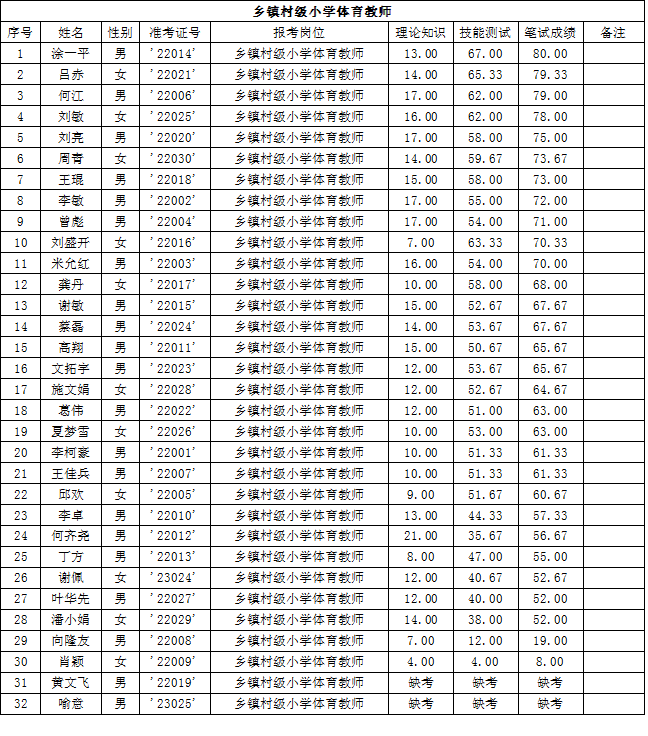 湖南省常德市漢壽縣2015年第二批教師招聘考試筆試成績公示