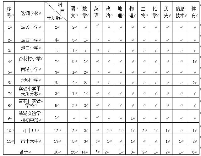 為合理調(diào)配城鄉(xiāng)教師資源,經(jīng)池州市貴池區(qū)編制委員會研究同意,決定從區(qū)內(nèi)農(nóng)村中小學(xué)(含農(nóng)村區(qū)直學(xué)校)選調(diào)60名教師到城區(qū)中小學(xué)任教,F(xiàn)就選調(diào)工作有關(guān)事項公告如下: