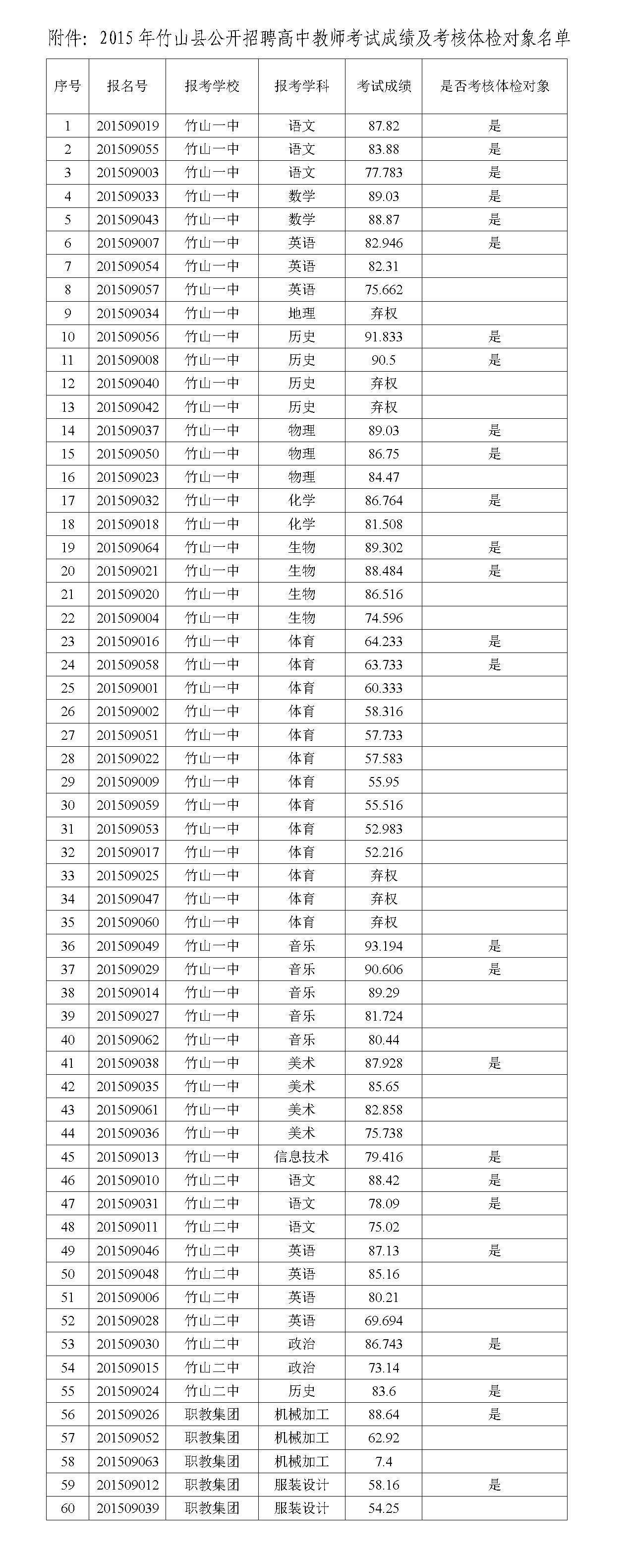 竹山縣2015年公開(kāi)招聘高中教師考試成績(jī)及考核體檢公告