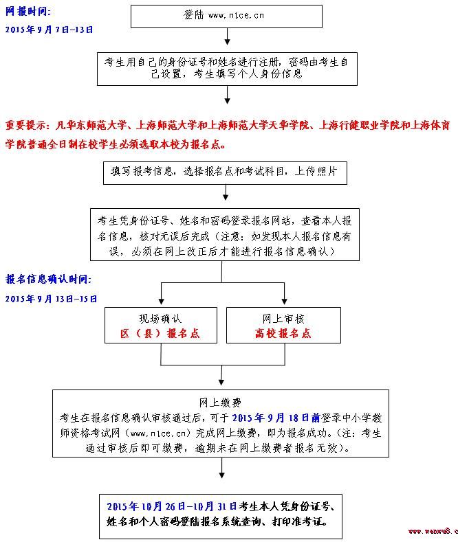 (七)2015年下半年面試報名時間預(yù)計為11月30日-12月4日。面試具體公告信息請于筆試成績公布后登錄中小學(xué)教師資格考試網(wǎng)(www.ntce.cn)及上海市教育人才交流服務(wù)中心網(wǎng)站(www.shehr.cn)查詢。