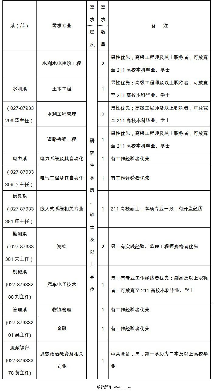 為推進學院人事制度改革,建立科學、規(guī)范、公正的用人機制,按照《湖北省事業(yè)單位公開招聘工作人員暫行辦法》(鄂人[2003]16號)的規(guī)定,及湖北省人力資源和社會保障廳《關于申報2012年省直屬事業(yè)單位公開招聘工作人員擬招崗位的通知》(鄂人社函[2011]589號)精神,根據(jù)工作需要,學院決定,面向社會公開招聘15名專業(yè)教師,現(xiàn)將有關事項公告如下:
