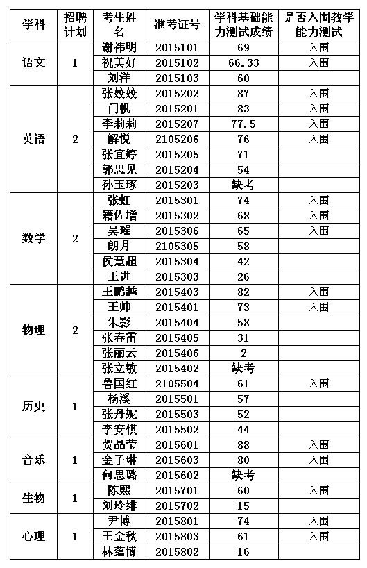 一、學(xué)科基礎(chǔ)能力測(cè)試成績(jī)及入圍教學(xué)能力測(cè)試人員名單