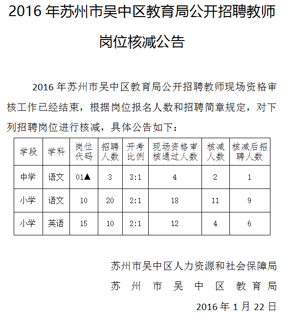 2016年江蘇省蘇州市吳中區(qū)教育局教師招聘崗位核減公告