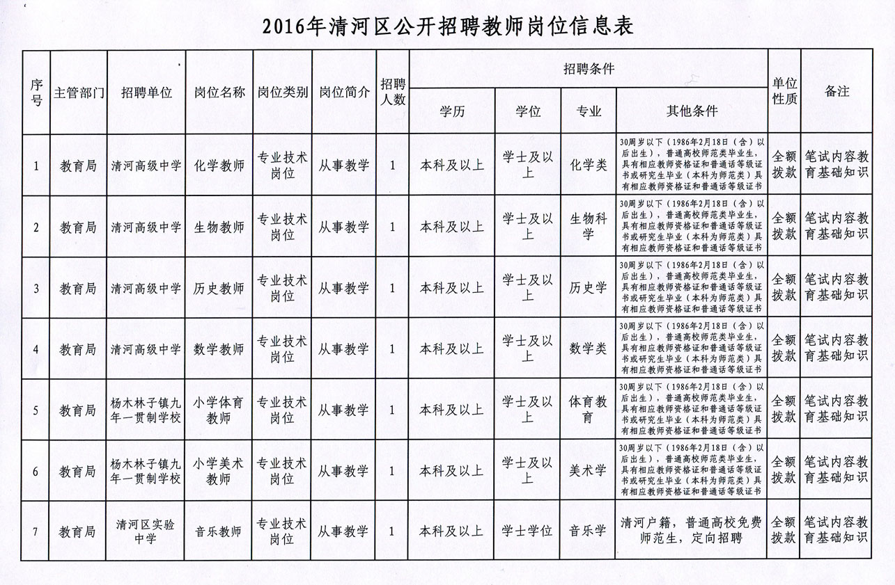 2016年遼寧省鐵嶺市清河區(qū)教師招聘崗位信息表