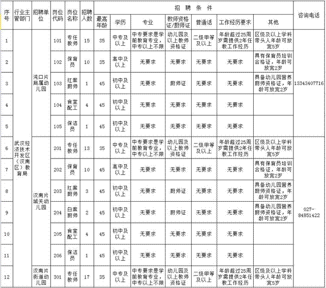 1.武漢開發(fā)區(qū)(漢南區(qū))2016年招聘幼兒園教職工崗位一覽表;