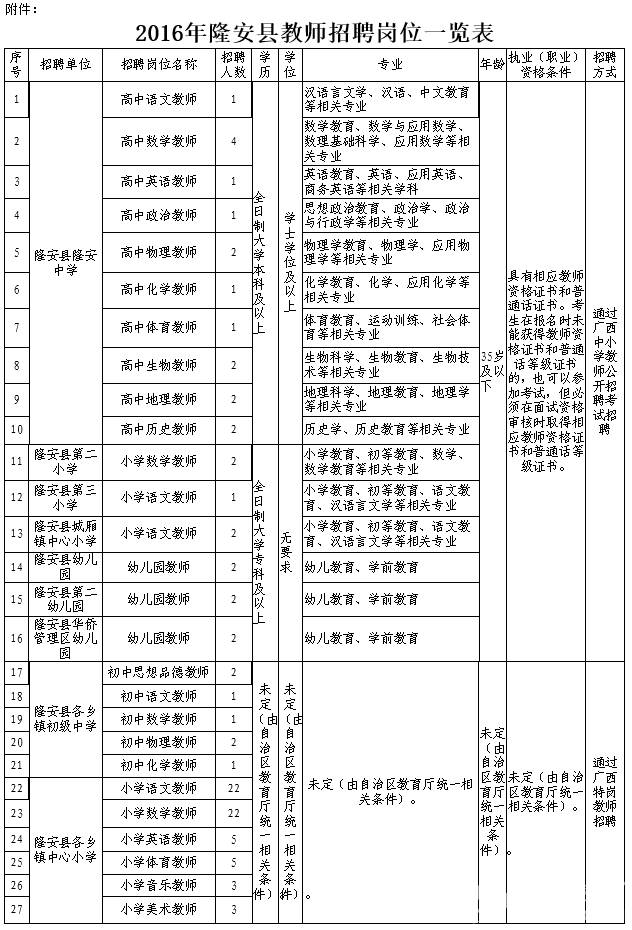 根據(jù)學(xué)校用人需求,隆安縣今年計(jì)劃招聘教師98名,其中通過(guò)廣西中小學(xué)教師公開(kāi)招聘考試招聘教師28名(高中教師17名,小學(xué)教師5名,幼兒園教師6名),招聘義教特崗教師70名(小學(xué)特崗教師60名,初中特崗教師10名),具體崗位要求和招聘方式見(jiàn)附件。