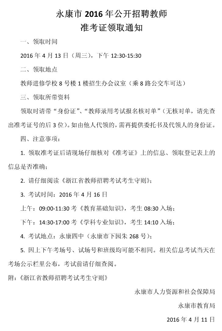 2016年浙江省永康市教師招聘準考證領取通知