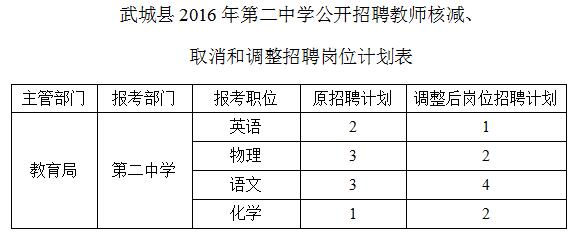 關(guān)于核減、取消和調(diào)整部分武城縣第二中學(xué)公開招聘教師崗位計(jì)劃的公告