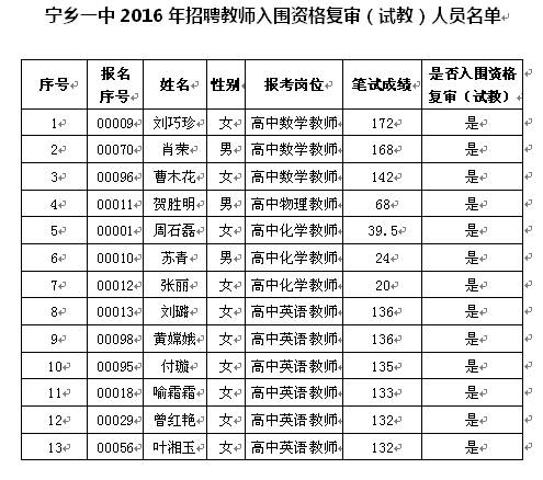 寧鄉(xiāng)一中2016年公開(kāi)招聘優(yōu)秀教師考試筆試已結(jié)束,根據(jù)《寧鄉(xiāng)縣第一高級(jí)中學(xué)2016年公開(kāi)招聘優(yōu)秀教師公告》,現(xiàn)將入圍資格復(fù)審(試教)人員名單及筆試成績(jī)進(jìn)行公示(名單見(jiàn)附表,其他考生筆試成績(jī)可在寧鄉(xiāng)人才微信公眾平臺(tái)“微服務(wù)”菜單“信息查詢”中查詢),并請(qǐng)入圍資格復(fù)審(試教)的各位考生于2016年5月5日上午7:30攜帶本人親筆簽名的報(bào)名表和本人有效居民身份證、學(xué)歷與學(xué)位證(含本科學(xué)歷證書(shū),應(yīng)屆畢業(yè)生須帶學(xué)校蓋章的含學(xué)業(yè)成績(jī)的畢業(yè)生推薦表、就業(yè)協(xié)議書(shū))、教師資格證、普通話證以及報(bào)考崗位所需的其他相關(guān)材料的原件和復(fù)印件到寧鄉(xiāng)縣第一高級(jí)中學(xué)信息樓一樓候考室參加資格復(fù)審。資格復(fù)審合格考生即為入圍考核(試教)考生,考核(試教)在資格復(fù)審之后進(jìn)行。未按時(shí)參加資格復(fù)審或資格復(fù)審不合格的人員取消考核(試教)資格。