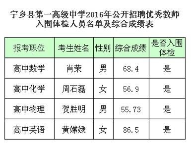 根據(jù)《寧鄉(xiāng)縣第一高級中學(xué)2016年公開招聘優(yōu)秀教師公告》規(guī)定,綜合筆試、考核(試教),現(xiàn)將入圍體檢人員名單及綜合成績公示如下(體檢時間另行通知,請密切關(guān)注寧鄉(xiāng)人才網(wǎng)和寧鄉(xiāng)人才官方微信平臺):
