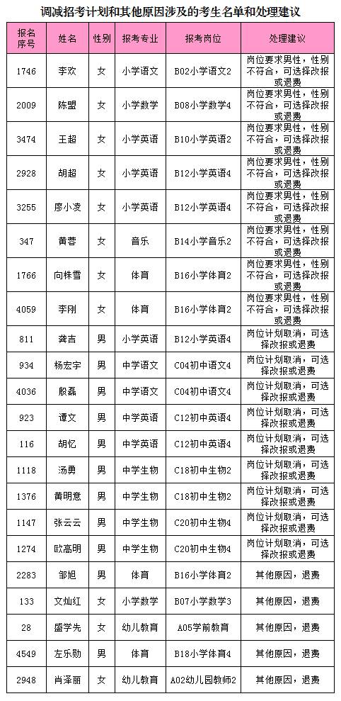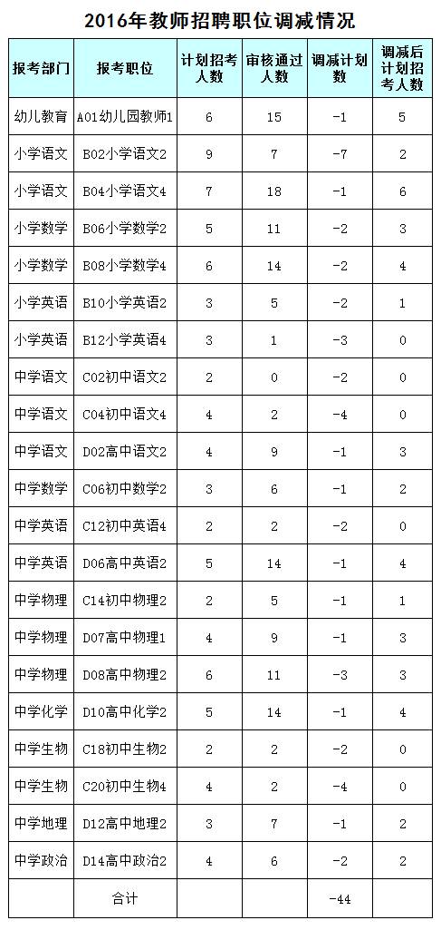 寧鄉(xiāng)縣2016年公開招聘中小學(xué)和幼兒園教師網(wǎng)絡(luò)報名已經(jīng)結(jié)束,根據(jù)《寧鄉(xiāng)縣2016年公開招聘中小學(xué)和幼兒園教師公告》中開考比例的規(guī)定和各崗位網(wǎng)上報名資格初審?fù)ㄟ^人數(shù),共有21個職位未達(dá)到開考比例,調(diào)減招聘計劃數(shù)44個,具體情況如下:
