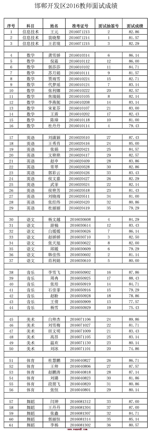 2016年河北省邯鄲經(jīng)濟技術(shù)開發(fā)區(qū)教師招聘面試成績公示