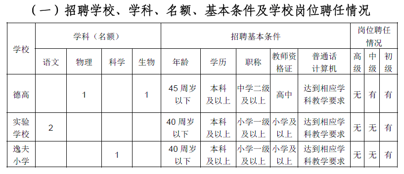 (一)招聘學校、學科、名額、基本條件及學校崗位聘任情況