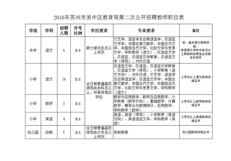 2016年江蘇省蘇州市吳中區(qū)教育局第二次教師招聘職位表(34名)