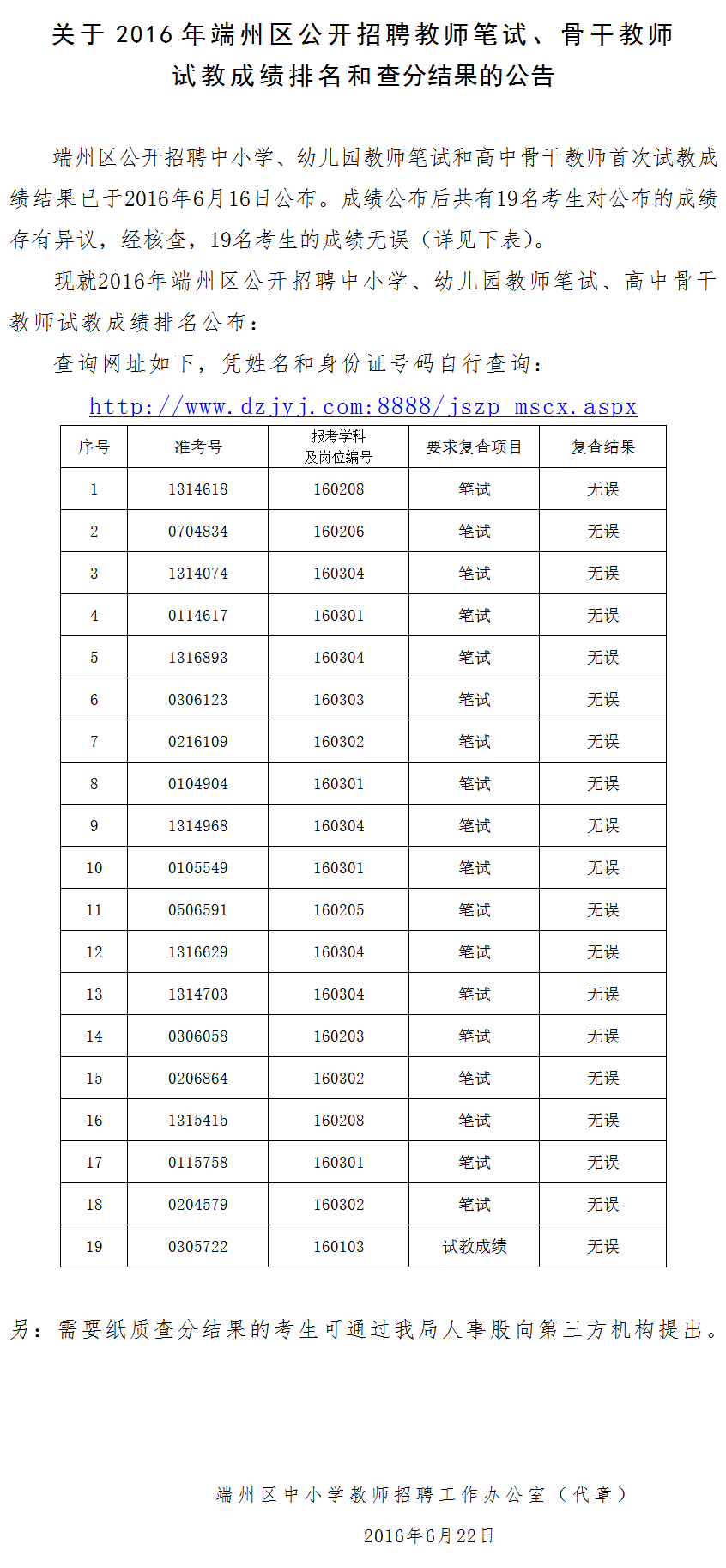 2016年廣東省肇慶市端州區(qū)教師招聘筆試、骨干教師試教成績排名和查分結果的公告