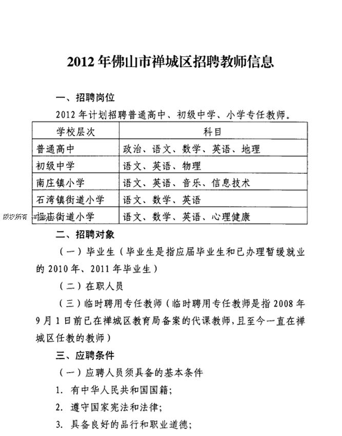 2012年廣東省佛山市禪城區(qū)招聘教師信息