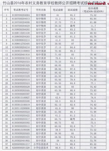 竹山縣2016年農(nóng)村義務(wù)教育學(xué)校教師公開招聘考試綜合成績公告
