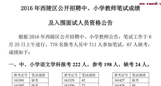 2016年西陵區(qū)公開招聘中、小學(xué)教師筆試成績(jī) 及入圍面試人員資格公告