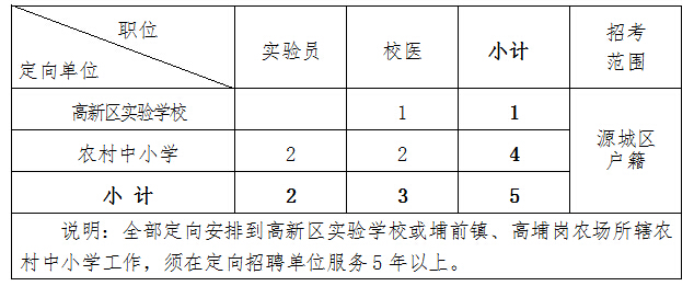 (八)工作調(diào)配:聘用人員確定后,由源城區(qū)教育局組織聘用人員簽訂定期定向服務(wù)協(xié)議,按照定向招考要求統(tǒng)一調(diào)配,不服從調(diào)配的,取消聘用資格。