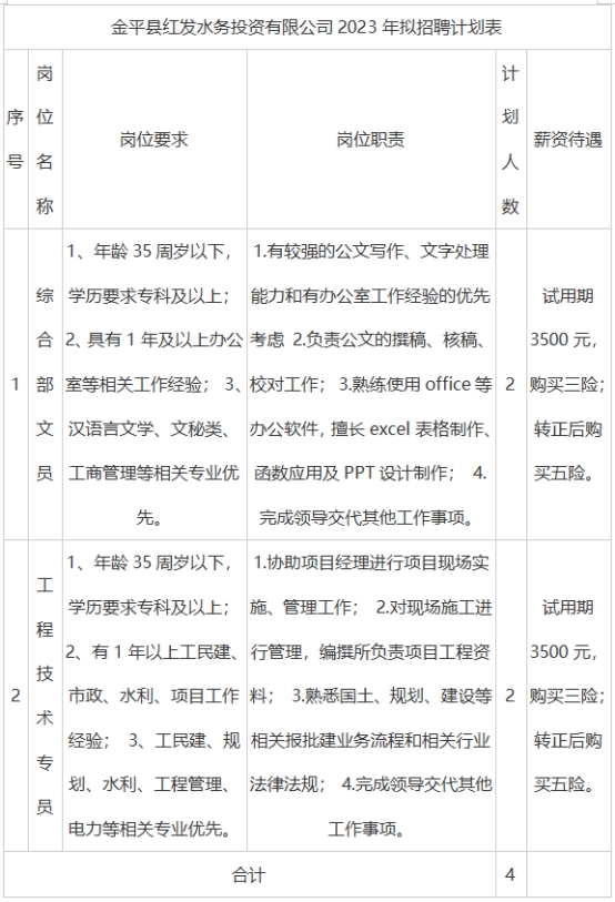 詳見(jiàn)附件1《金平縣紅發(fā)水務(wù)投資有限公司2023年擬招聘計(jì)劃表》。