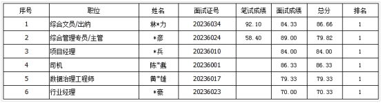 根據(jù)《福建省大數(shù)據(jù)集團(tuán)南平有限公司2023年公開招聘工作人員簡(jiǎn)章》,經(jīng)過網(wǎng)上報(bào)名、資格初審、筆試、心理測(cè)評(píng)、面試等程序,現(xiàn)確定擬錄用人員名單并予以公示,其他考生成績(jī)請(qǐng)登入海峽人才網(wǎng)報(bào)名系統(tǒng)(http://ksbm.hxrc.com/index.aspx)查詢。
