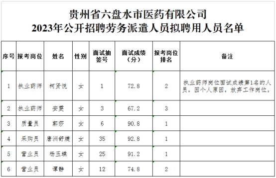 附件:貴州省六盤水市醫(yī)藥有限公司2023年公開招聘勞務(wù)派遣人員擬聘用人員名單