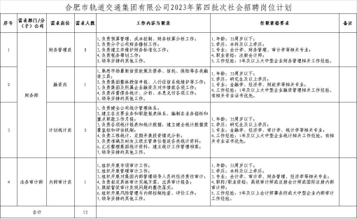 計(jì)劃招聘財(cái)務(wù)部財(cái)務(wù)管理崗、融資崗等4個(gè)崗位共計(jì)12人,具體崗位信息如下:
