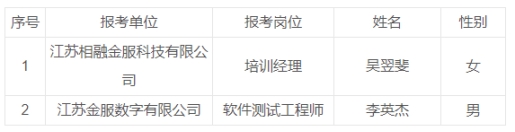 根據(jù)《蘇州市相城區(qū)區(qū)屬國有企業(yè)人員招聘簡章》(2023年第2批)安排,江蘇金服數(shù)字有限公司通過考試、體檢和考察等環(huán)節(jié)的審核,最終擬錄用2人,現(xiàn)將擬錄用結(jié)果予以公示如下: