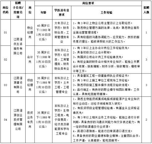 江陰濱江澄源投資集團有限公司成立于2018年12月,是江陰高新區(qū)管委會下屬國有企業(yè),是區(qū)域綜合運營商和綜合性投資管理集團。為進一步優(yōu)化集團公司員工隊伍,促進公司各項業(yè)務(wù)均衡發(fā)展,確保招聘高質(zhì)量人才,根據(jù)濱江澄源集團2024年實際工作需要,現(xiàn)決定面向社會公開招聘工作人員9名。其中江陰澄優(yōu)生活服務(wù)有限公司招聘4人,江陰澄源建設(shè)有限公司招聘3人,江陰澄源創(chuàng)業(yè)投資管理有限公司招聘2人。