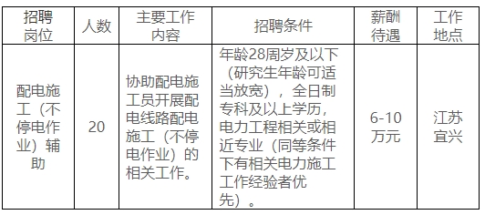 本批次計(jì)劃招聘配電施工(不停電作業(yè))輔助人員20名,具體如下: