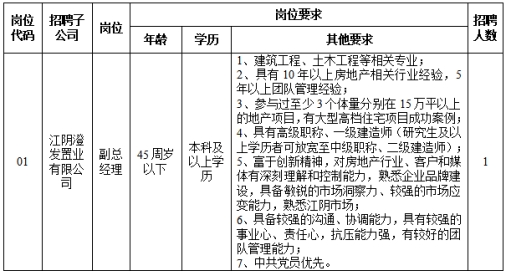 因業(yè)務(wù)需要向社會公開招聘江陰澄發(fā)置業(yè)有限公司副總經(jīng)理1名,現(xiàn)將有關(guān)事項公告如下,熱忱歡迎有志之士加入我們,實現(xiàn)共同發(fā)展!
