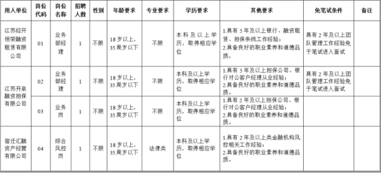 匯融集團(tuán)下屬子公司江蘇經(jīng)開(kāi)恒榮融資租賃有限公司、宿遷匯融資產(chǎn)經(jīng)營(yíng)有限公司、江蘇開(kāi)泉融資擔(dān)保有限公司因業(yè)務(wù)發(fā)展需要,面向社會(huì)公開(kāi)招聘4名工作人員,特制定簡(jiǎn)章如下:
