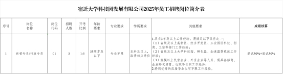 招聘單位、崗位及相關要求等內(nèi)容,詳見附件《宿遷大學科技園發(fā)展有限公司2025年員工招聘崗位簡介表》(以下簡稱《崗位表》)。
