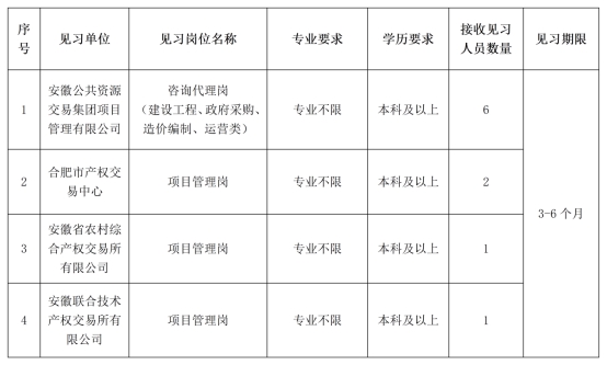 安徽公共資源交易集團(tuán)是合肥市國資委重點(diǎn)監(jiān)管的國有大型企業(yè),也是國內(nèi)首個(gè)國有全資公共資源交易企業(yè),注冊資本人民幣2億元。業(yè)務(wù)領(lǐng)域涉及建設(shè)工程、政府采購、產(chǎn)權(quán)交易等傳統(tǒng)公共資源交易領(lǐng)域,以及農(nóng)村綜合產(chǎn)權(quán)、技術(shù)產(chǎn)權(quán)、環(huán)境能源、文化版權(quán)、數(shù)據(jù)交易等新型公共資源交易領(lǐng)域。安徽交易集團(tuán)下轄安徽公共資源交易集團(tuán)項(xiàng)目管理有限公司、安徽省農(nóng)村綜合產(chǎn)權(quán)交易所、安徽聯(lián)合技術(shù)產(chǎn)權(quán)交易所和合肥市產(chǎn)權(quán)交易中心等全資、控股子公司及參股公司。為幫助高校畢業(yè)生等青年群體積累實(shí)踐經(jīng)驗(yàn)、增強(qiáng)就業(yè)能力,現(xiàn)面向社會(huì)公開招募見習(xí)人員,具體要求如下: