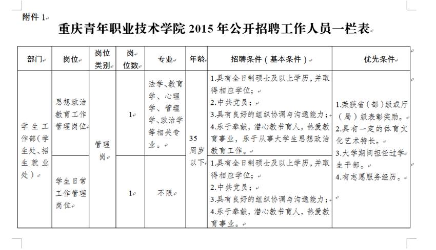 重慶青年職業(yè)技術(shù)學(xué)院2015年公開(kāi)招聘工作人員簡(jiǎn)章