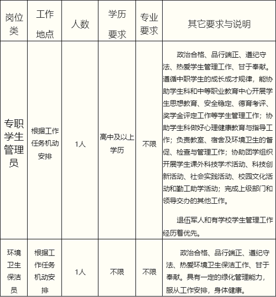 專職學(xué)生管理員崗位工資待遇為3000元/月(含個人繳納社會保險費);環(huán)境衛(wèi)生保潔員崗位工資待遇為2800元/月(含個人繳納社會保險費)。