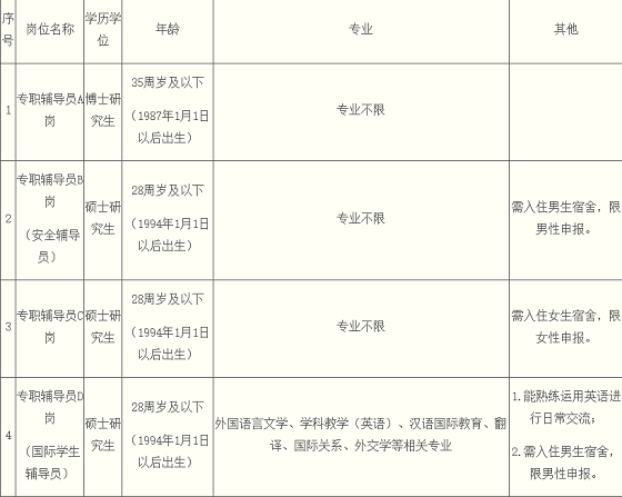 考試分為線上筆試、線上面談和線下面試,滿分均為100分,按照崗位類別分別排序。專職輔導(dǎo)員A崗免筆試,直接進(jìn)入線上面談。具體安排和要求通過湖北大學(xué)主頁和湖北大學(xué)招聘網(wǎng)另行通知。