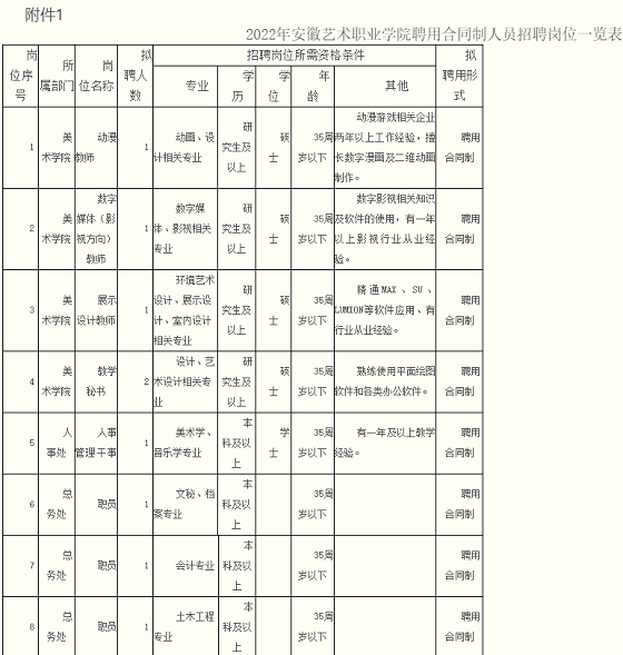 5、應(yīng)聘者所學(xué)專(zhuān)業(yè)符合崗位要求,具體崗位條件詳見(jiàn)附件1:《2022年度安徽藝術(shù)職業(yè)學(xué)院招聘崗位一覽表》。