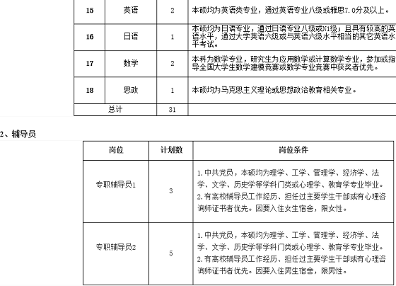為適應學院教育事業(yè)發(fā)展的需要,現(xiàn)面向社會公開招聘專職教師31名,專職輔導員8名具體崗位和要求如下: